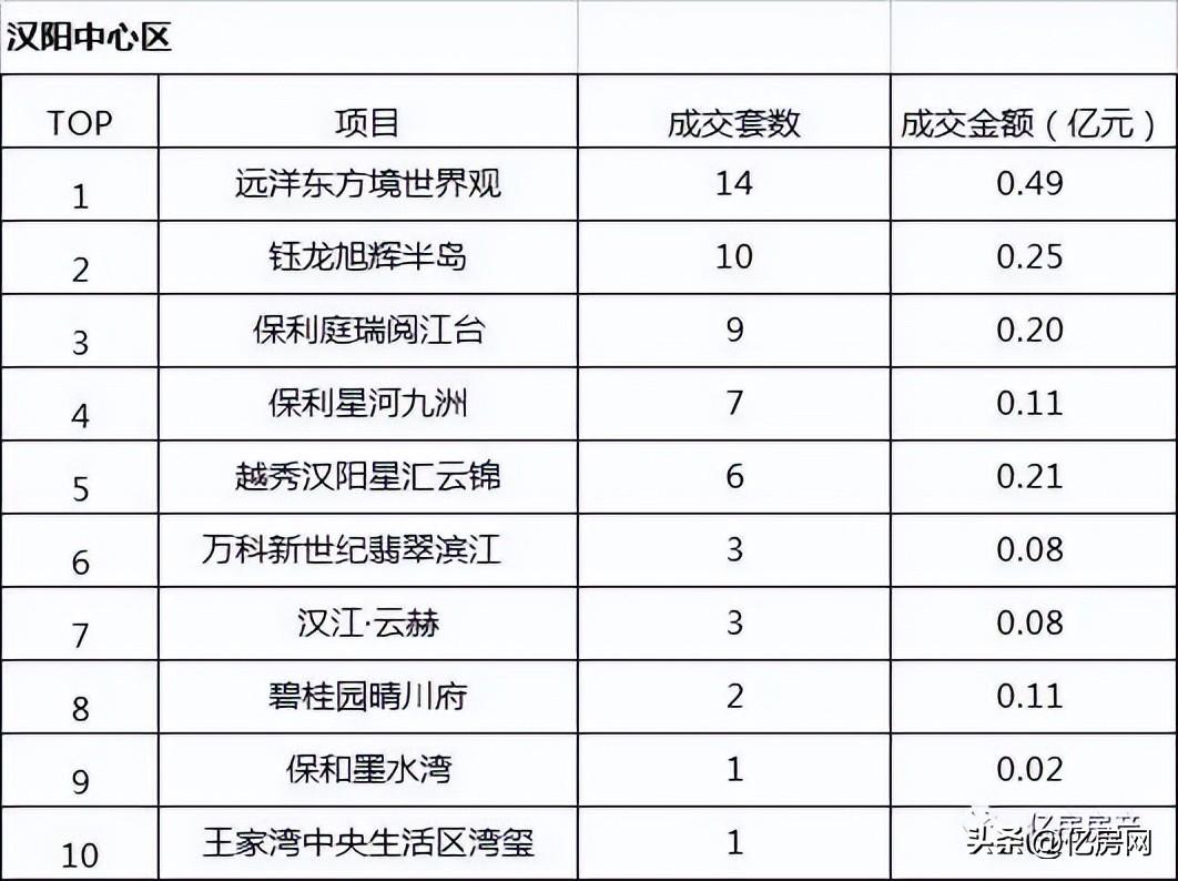 本周汉阳中心区楼盘销售排行TOP10:1、远洋东方境世界观;2、钰龙旭辉半岛;3、保利庭瑞阅江台;4、保利星河九洲;5、越秀汉阳星汇云锦;6、万科新世纪翡翠滨江;7、汉江·云赫;8、碧桂园晴川府;9、保和墨水湾;10、王家湾中央生活区湾玺;