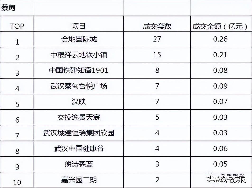 楼盘销售排行TOP10:1、金地国际城;2、中粮祥云地铁小镇;3、中国铁建知语1901;4、武汉蔡甸吾悦广场;5、汉映;6、交投逸景天宸;7、武汉城建恒瑞集团欣园;8、武汉中国健康谷;9、朗诗森蓝;10、嘉兴园二期;
