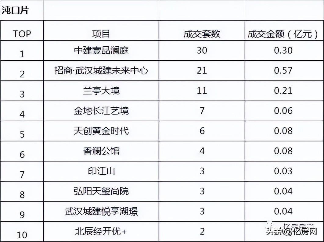 楼盘销售排行TOP10:1、中建壹品澜庭;2、招商·武汉城建未来中心;3、兰亭大境;4、金地长江艺境;5、天创黄金时代;6、香澜公馆;7、印江山;8、弘阳天玺尚院;9、武汉城建悦享湖璟;10、北辰经开优+;