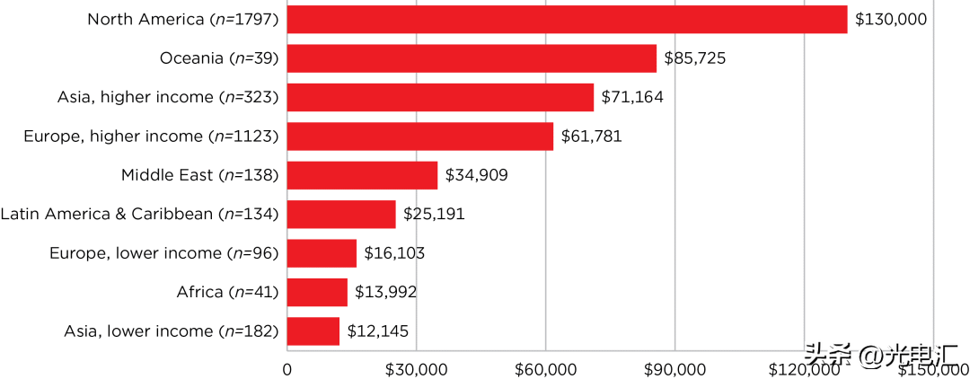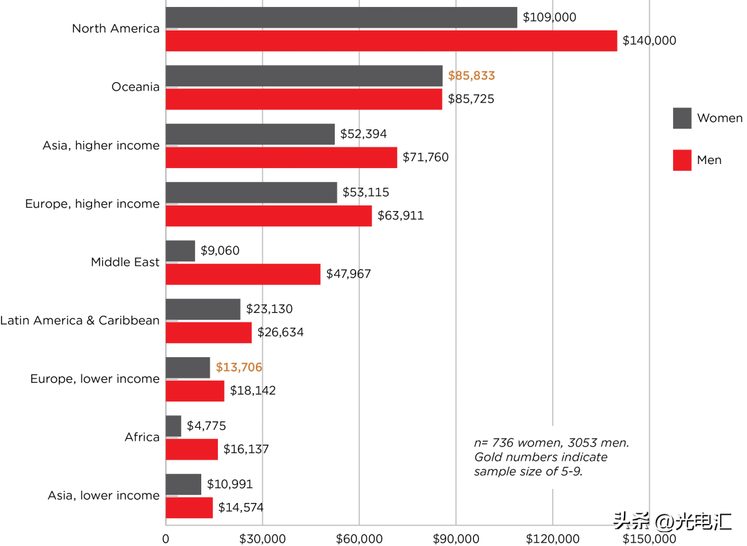 北美、大洋洲和亚洲的高收入地区脱颖而出,成为薪酬最高的地区,薪资中位数分别为130,000美元、85,725美元和71,164美元;其次是欧洲的高收入地区,薪资中位数为61,781美元。不同区域的收入差距,很大程度都与其当地的经济发展水平息息相关。