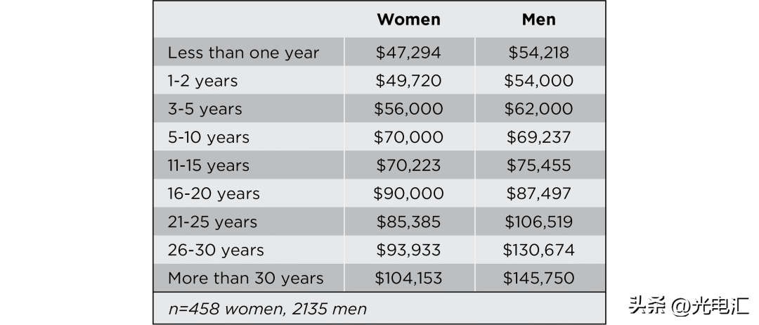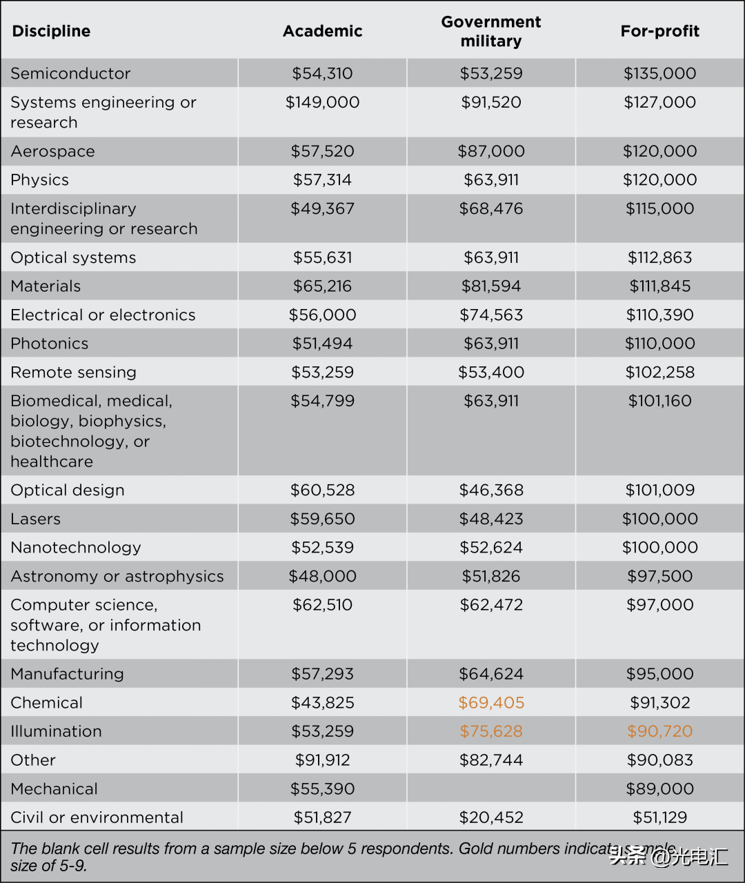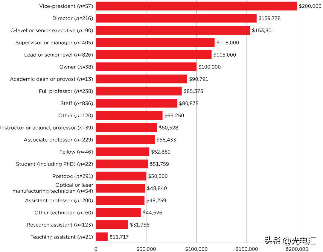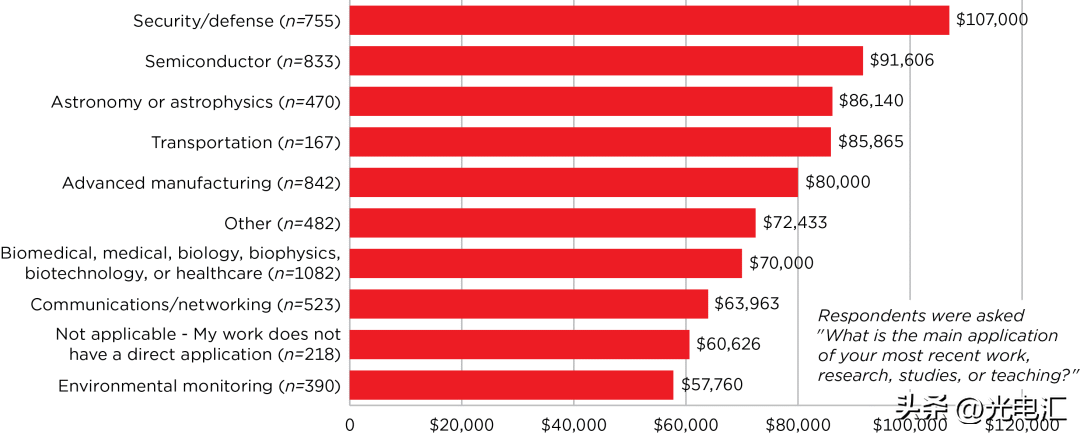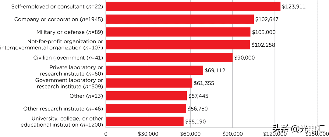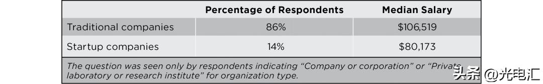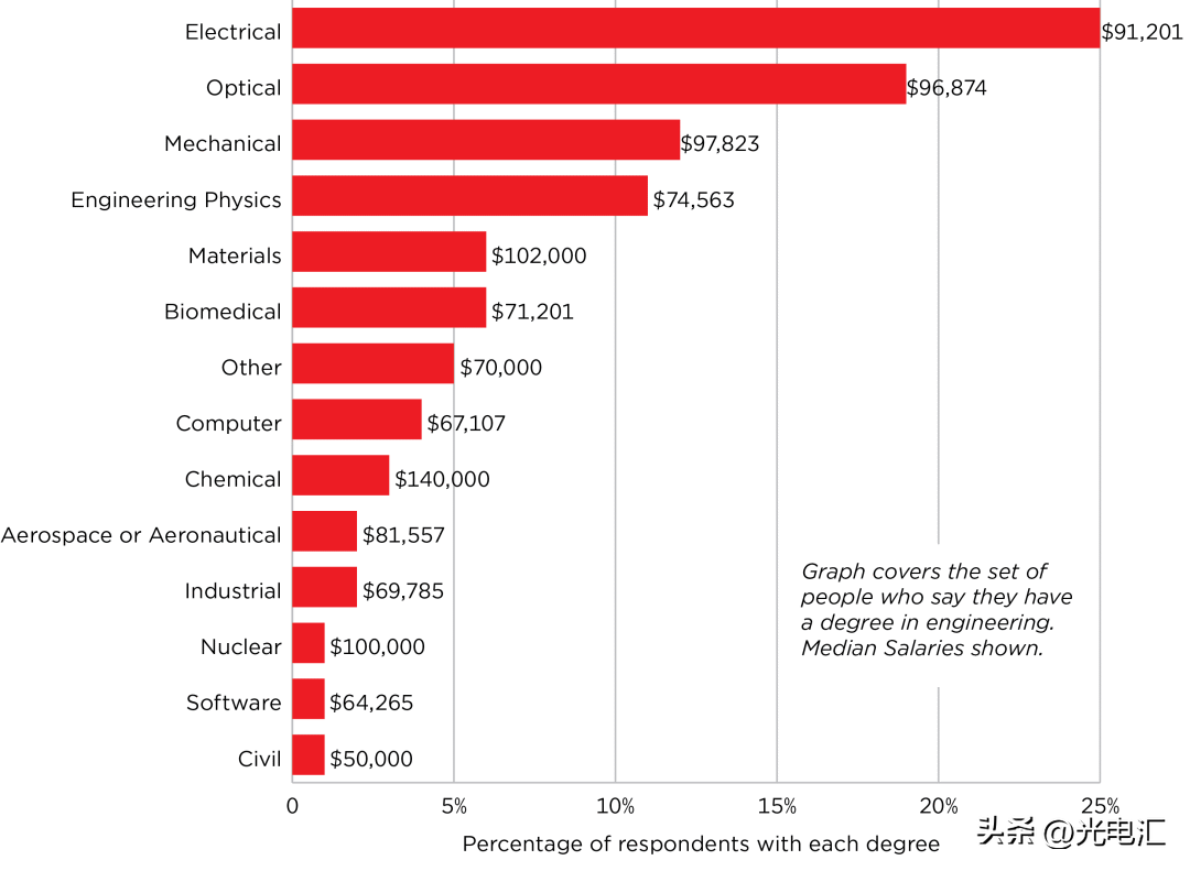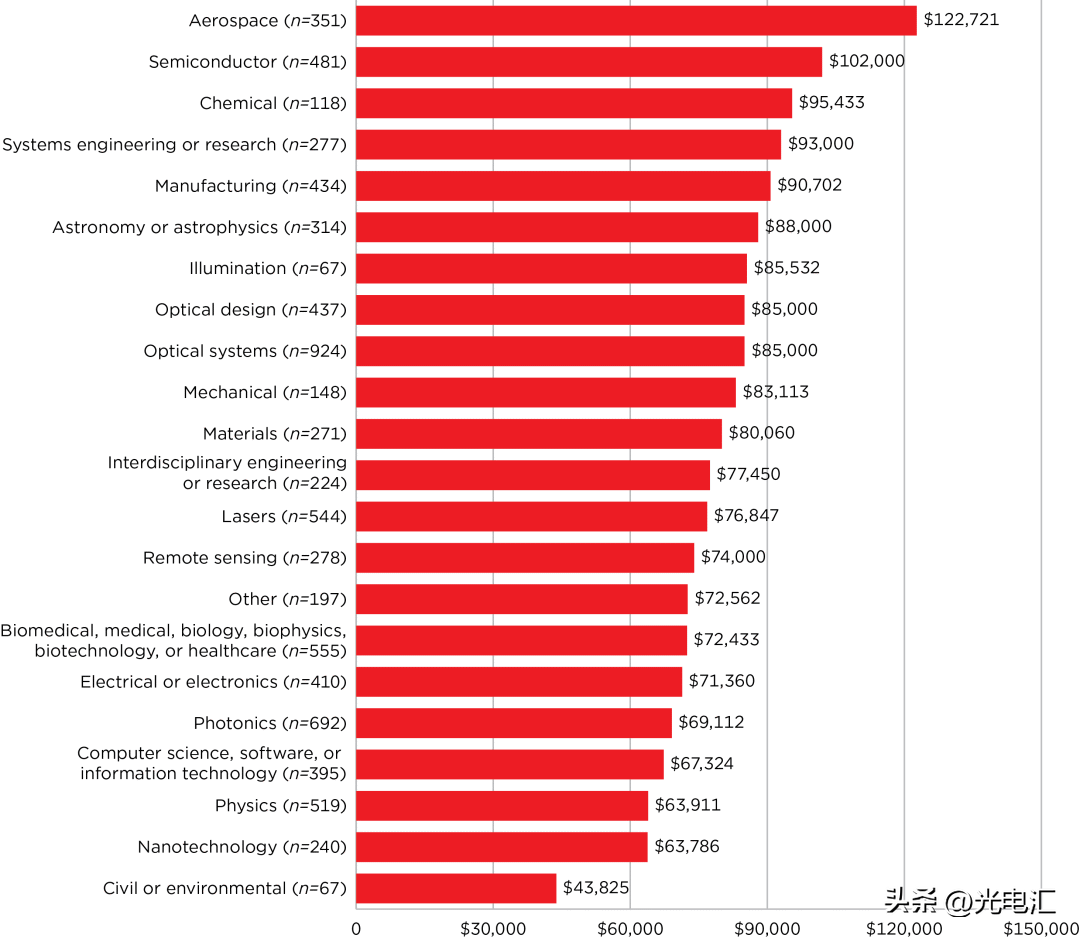 在拥有工程师学位的被调查者中,25%的员工是电子专业,薪资中位数为91,201美元;光学专业约占18%,薪资中位数为96,874美元;机械专业约占12%,薪资中位数为97,823美元;工程物理学专业约占11%,薪资中位数为74,563美元;材料专业和生物医学分别约占6%,薪资中位数分别为102,000美元、71,201美元。各专业薪资中位数如下图表4所示: