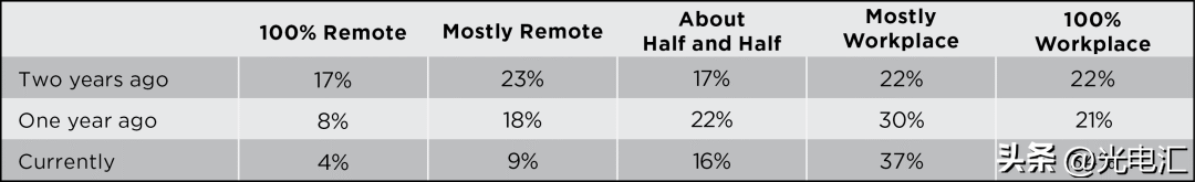 新冠疫情促进了向线上远程工作的转变。两年前,当COVID-19大流行对工作场所的影响最为严重时,40% 的调查受访者有一半或更多的时间在远程工作。一年前,这个数字变为26%,而目前这一数字已下降至 13%。