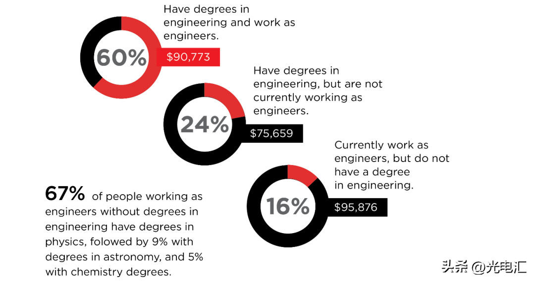 在被调查者中,65% 的全职员工认为自己的身份是工程师,其中60%拥有工程学位且担任工程师职位,年薪中位数90,773美元;24%拥有工程学位但并未担任工程师职位,年薪中位数75,659美元;16%从事工程师工作但未拥有工程师学位,年薪中位数95,876美元。无工程师学位但从事工程师职业的员工中67%具有物理学位,9%有天文学学位,5%的具有化学学位。