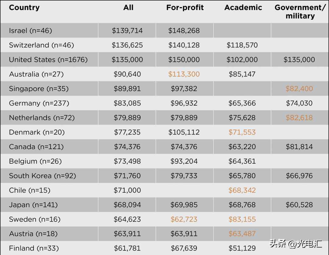 在列出的大多数国家/地区,企业员工收入普遍高于学术界的同行。