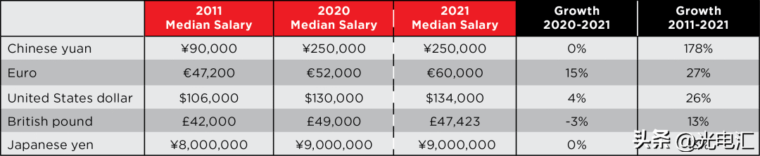 2021年,以欧元和美元支付的工资有所增长,欧元增长 15%,美元增长 4%。以人民币或日元支付的工资中位数没有变化,而以英镑计算的收入下降了3%。在进行这项调查的13年里,这五个货币组的工资中位数均增长了13%或更多,其中以人民币支付的工资增幅最大,自 2011 年以来增长了 178%。