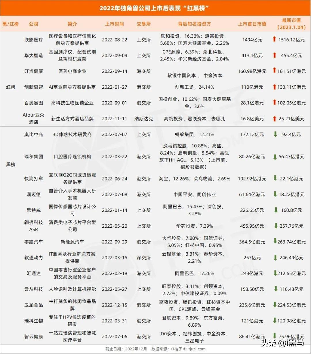 IT 桔子数据显示,2022 年共有 19 家独角兽公司敲钟成为上市公司,分别为联影医疗、翱捷科技 ASR、零跑汽车、软通动力、华大智造、汇通达、云从科技、SmartSens 思特威、奥比中光、创新奇智、卫龙食品、瑞科生物、瑞尔集团、快狗打车、智云健康、百奥赛图、叮当快药、润迈德、Atour 亚朵酒店。
