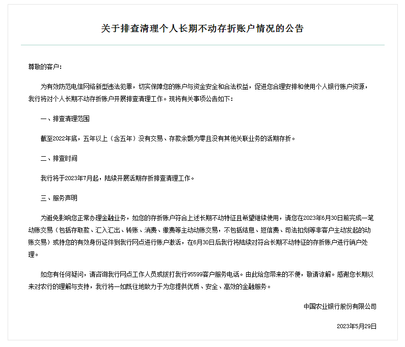 按照农业银行的规定,如果符合相关条件,而且在7月之前,大家仍然没有任何交易的账户就会被清理甚至注销。