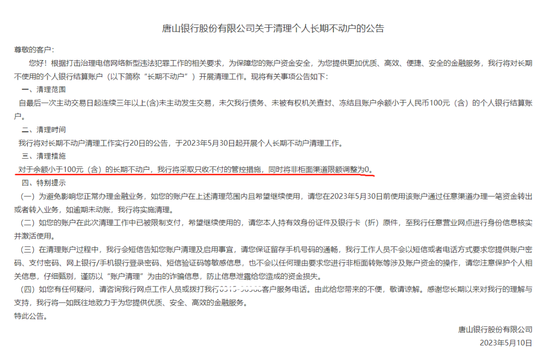 另外有部分银行对于长期不动户余额的定义比较高,比如唐山银行清理的对象是连续三年以上未主动发生交易,未欠债务,