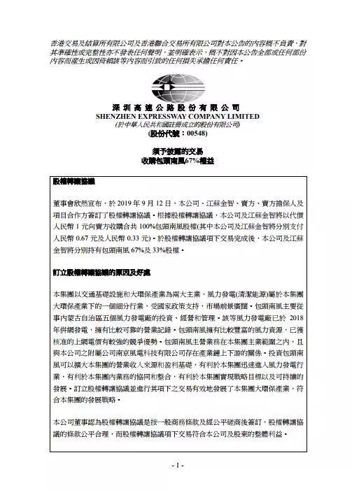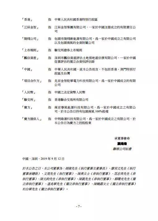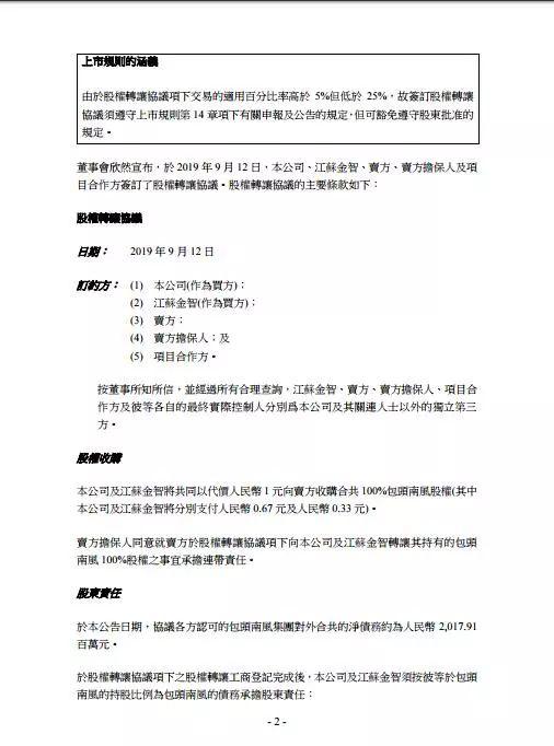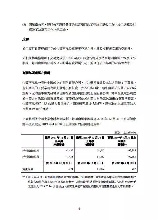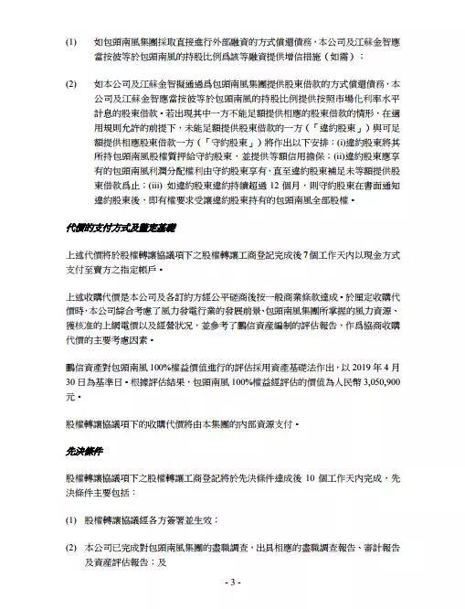 北极星风力发电网获悉,日前深高速、江苏金智9月12日发布公告称,与南京宁风能源科技有限公司(卖方)、中明绿源(卖方担保人)签署了股权转让协议。 深高速、江苏金智将以1元人民币收购包头南风100%股权(深高速、江苏金智分别支付0.67 元、 0.33 元)。 包头南风为一家于中国成立的有限责任公司,其注册及实缴股本为人民币6百万元。 包头南风的主要业务为风力发电项目投资。 于本公告日期,包头南风于内蒙古自治区设有5家均从事风力发电项目的投资开发与经营的全资附属公司,其中四风电公司位于内蒙古自治区包头市达茂旗; 而陵翔公司位于内蒙古自治区包头市白云鄂博矿区。
