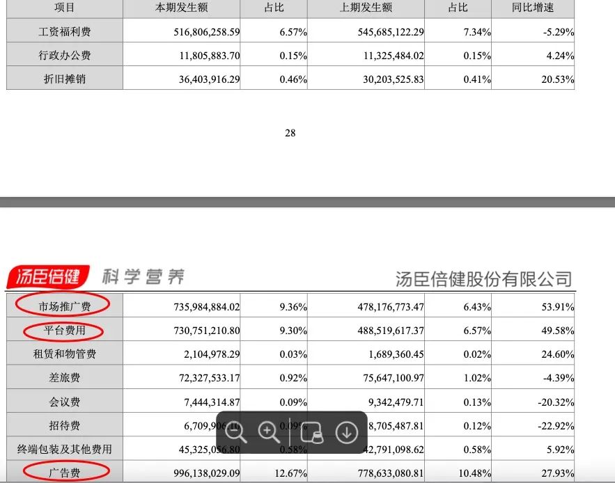 分析销售费用构成可见,汤臣倍健2022年投放的市场推广费、平台费用、广告费分别为7.35亿元、7.3亿元、9.66亿元,同比分别增长53.91%、40.58%、27.93%。