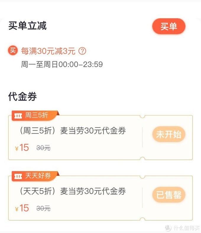 活动内容:活动期间每周三10点起,用户在【掌上生活】APP—饭票—周三五折,可参与麦当劳15元抵30元代金券秒杀。