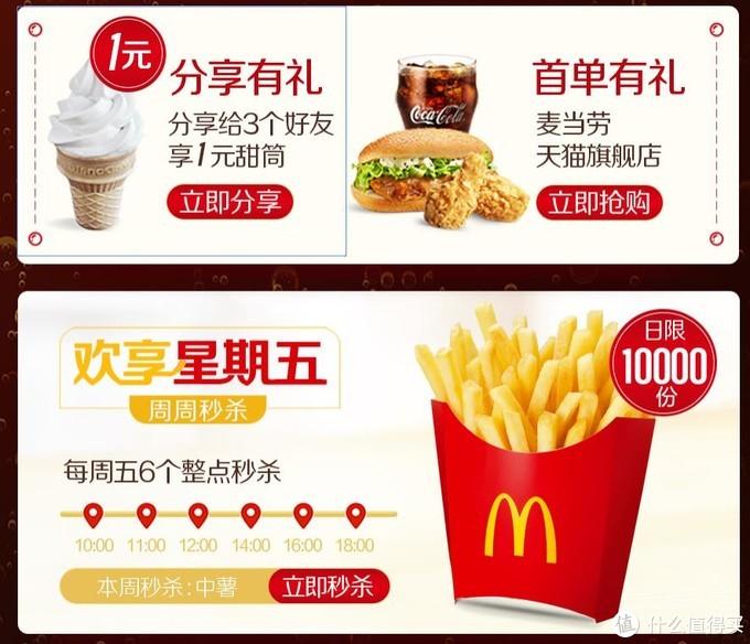 另外每周五10点/11点/12点/14点/16点/18点6个整点会有不同热门单品秒杀,这周的是1元秒杀中薯条,日限1万份,每个ID限1次。以上两个活动都是购买后直接用电子凭证到门店兑换即可。