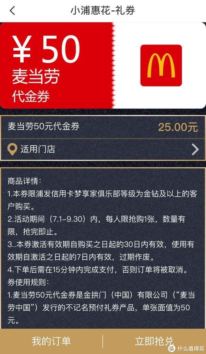 活动内容:活动期间每周二,符合条件用户在【浦大喜奔】APP—小浦惠花——天天半价可抢购麦当劳25元抵50元代金权益。