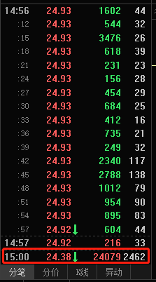 盘面实时数据显示,15点左右,有24079手卖单抛出,抛售价格为24.38元。按此计算,这笔卖单金额超过5800万元。