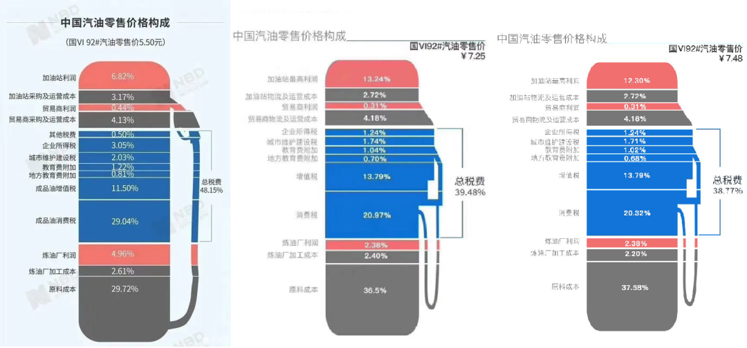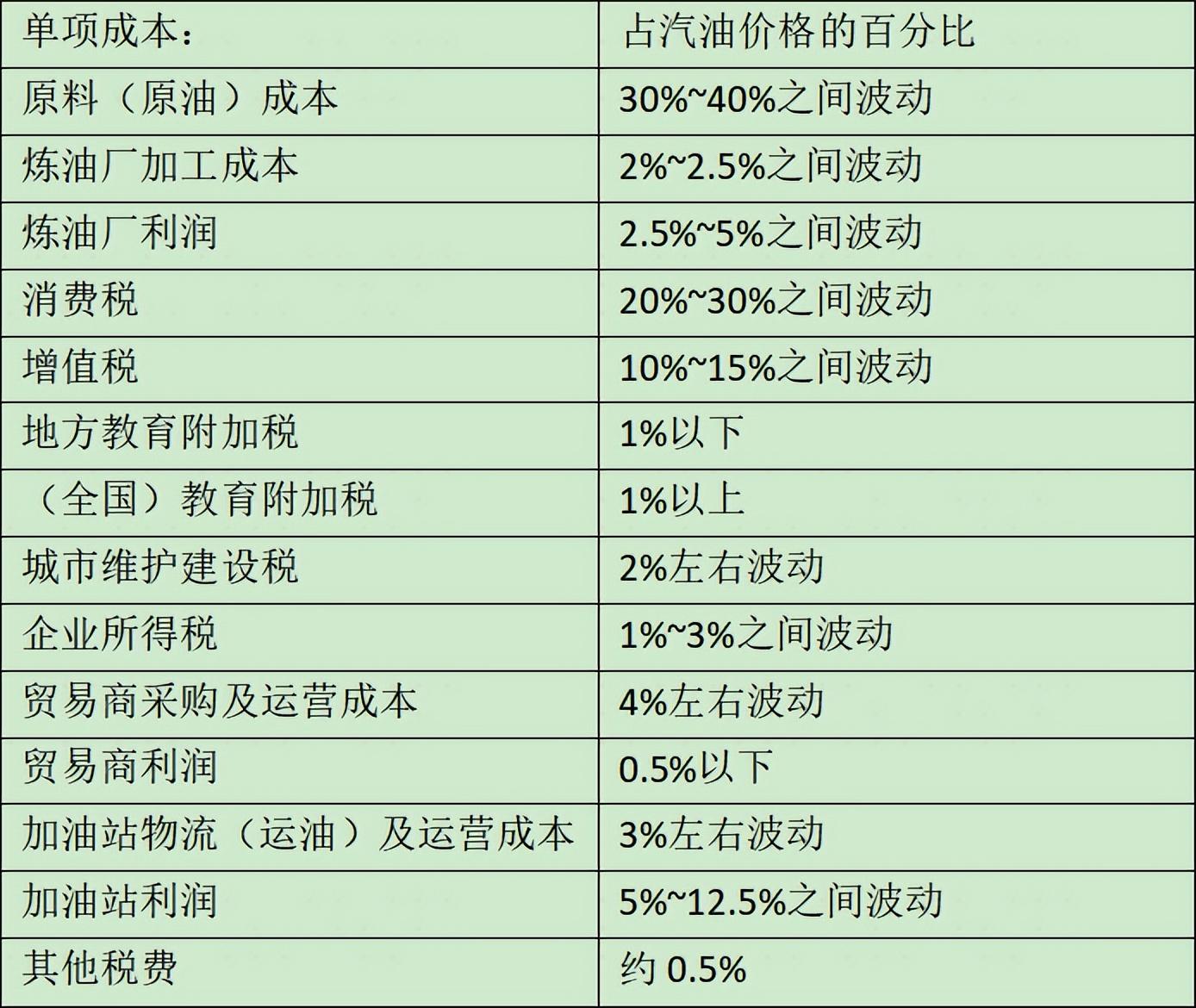 然而我们却收集到了具有代表性的官方公布的3份《中国汽油零售价格构成》。通过对比计算,我们可以把“汽油里每一份成本、利润、税费”大概的占比都罗列出来,并列出他们大致的占比,如下: