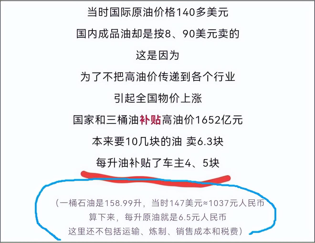 但文章里用来计算“汽油成本”的算法,却引起了大家的热烈讨论。文章里描述的算法是这样的:按照2008年时的美元汇率,当时一桶石油的价格是1037元人民币,一桶石油是159公升,所以算出1公升石油就是6.5元人民币,当初汽油零售价是6.3元。——显然,他们是赔本贴钱给车主供应汽油了。