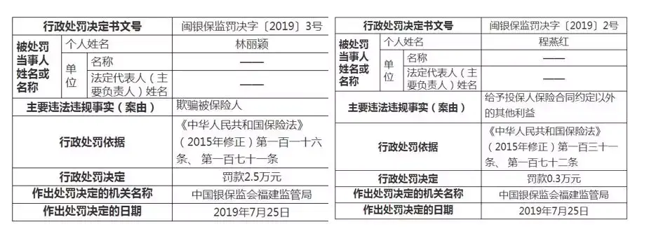 同日,中国银保监会福建监管局还向2名保险从业者发出行政处罚书,保险从业者林某在办理保险业务活动中涉嫌欺骗保险人,程某则因涉嫌给予投保人保险合同约定以外的其他利益,这2名保险从业者的行为均违反《保险法》第131条的规定,分别被罚款2.5万元和0.3万元。
