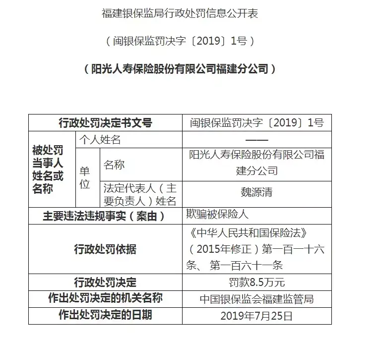 。阳光人寿福建分公司的行为涉嫌违法,7月25日,中国银保监会福建监管局依据《保险法》第161条规定,决定予以该公司罚款8.5万元。