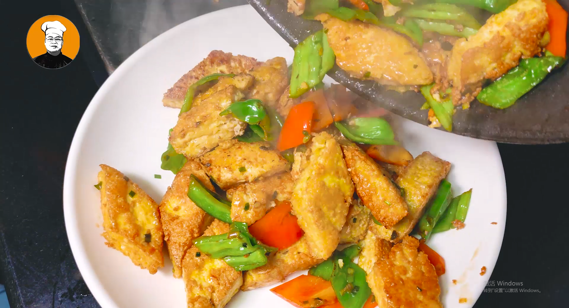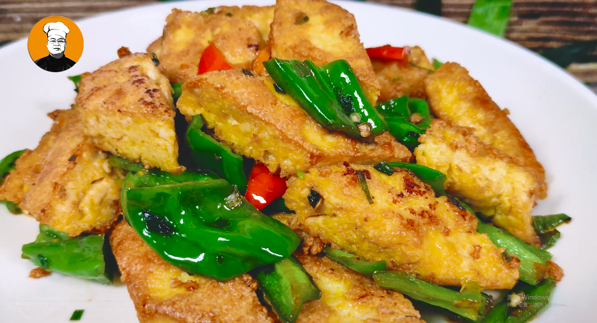 6、热锅倒油,放入鸡蛋豆腐煎一下,煎至两面金黄,盛出备用。锅中留底油,先放入葱末爆香,放入青红椒片翻炒,再淋入少许生抽,放入鸡蛋豆腐翻炒,翻炒均匀即可出锅