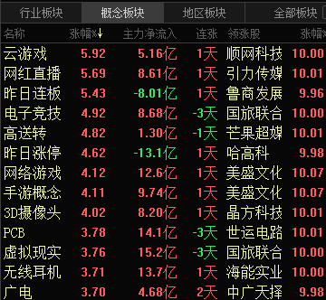 相对比较“矜持”的权重股,题材股更加乐于表现。深证成指和中小板指强势拉升,其中,行业板块方面,文化传媒、电信运营、软件服务涨幅居于前三名,无一下跌;题材板块方面,云游戏、网红直播、电子竞技涨幅居于前三名,仅白酒、流感2个板块微跌。