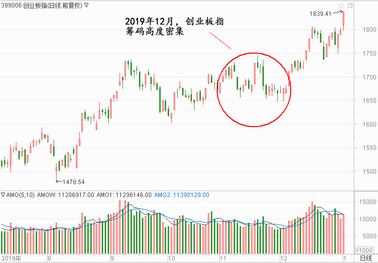 从A股几大指数来看,这是2005年以来第四次筹码低位密集,在2005年年底、2008年底、2014年7月,沪指均呈现这一特征,而2019年12月,沪指、深成指、创业板指也呈现筹码低位密集。目前,指数已经脱离这个筹码密集区,因此降准是暴涨的助推剂,而非本质影响因素。从筹码形态来看,创业板指的最为集中,这表明中小创有望成为本次行情的主战场。