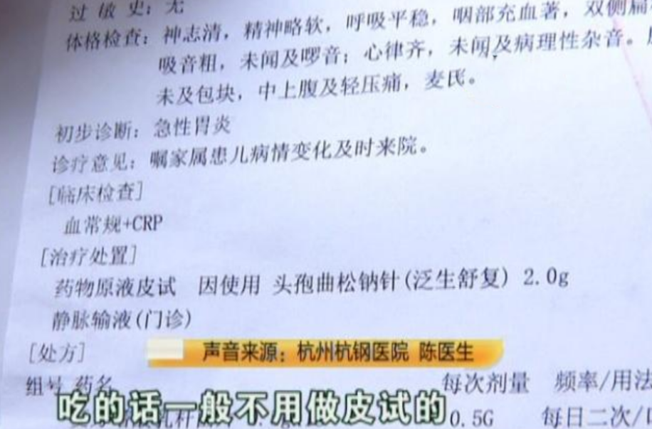 家住在杭州的余女士带着孩子去杭钢医院看病,当天孩子胃肠不舒服,医生建议输液打头孢,但是做了皮试之后呈阳性,余女士让医生给开点药回家服用,看看怎么样。随后医生就给余女士拿了药,回家吃了药之后,孩子身上起了红疹,这时,余女士仔细看了一下药,才发现医生给开的是头孢。