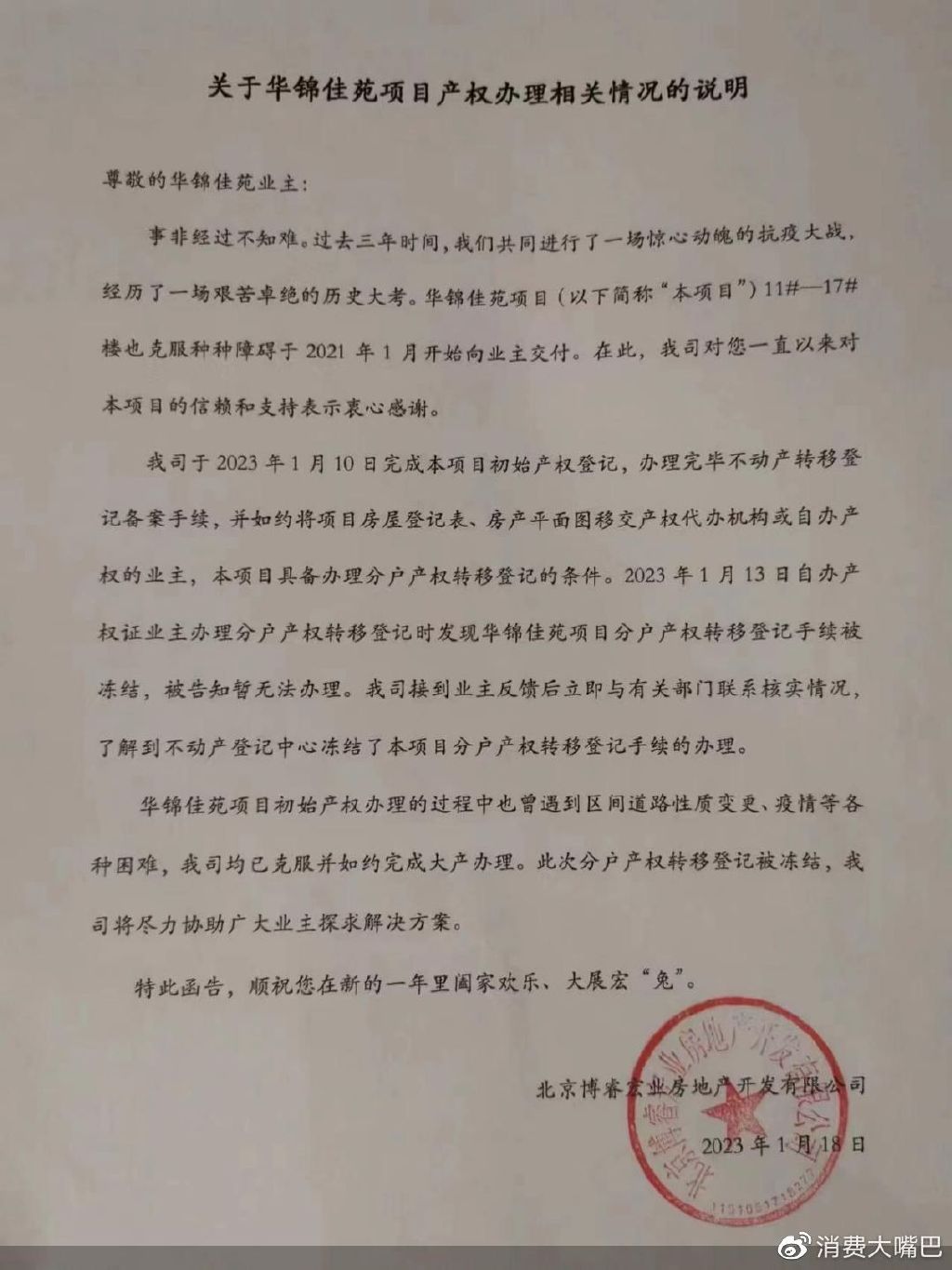 2023年1月18日,开发商方面给出了一份“关于华锦佳苑(和悦华锦)项目产权办理相关情况的说明”,其中提及,项目具备办理分户产权转移登记的条件,但在2023年1月13日自办产权证业主办理分户产权转移登记时发现华锦佳苑项目分户产权转移登记手续被冻结,被告知暂无法办理。接到业主反馈后立即与有关部门联系核实情况,了解到不动产登记中心冻结了本项目分户产权转移登记手续的办理,但依然没有解释冻结的原因。