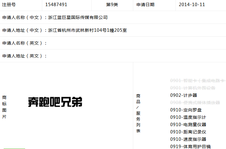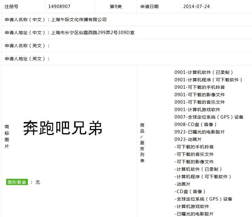 通过查询麦标库得知,午际公司在2014年7月24日提交了“奔跑吧兄弟”第9类商标的注册申请,比正主蓝巨星公司2014年10月11日早提交了2个多月成功注册了下来。