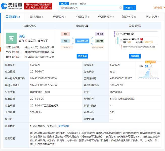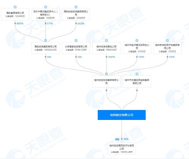 天眼查数据显示,桂林航空的运营主体是桂林航空有限公司,成立于2015年6月,注册资本为6亿元,公司的法定代表人为公司董事长胥昕,公司主要经营范围包括;国内航空客货运输业务;旅行社业务;票务代理服务等。目前该公司有两位股东,分别为桂林市交通投资控股集团有限公司和桂林航空旅游集团有限公司,其中桂林航空旅游集团有限公司由海航集团有限公司控股,桂林航空国际旅行社有限公司由桂林航空有限公司全资控股。
