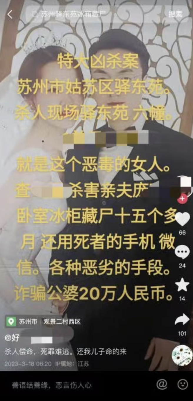 3月18日,有网友发布视频称,家住苏州市姑苏区驿东苑的查某杀害亲夫庞某,并在卧室冰柜中藏尸15个多月,还用死者的手机发微信,事件随即引发广泛关注。