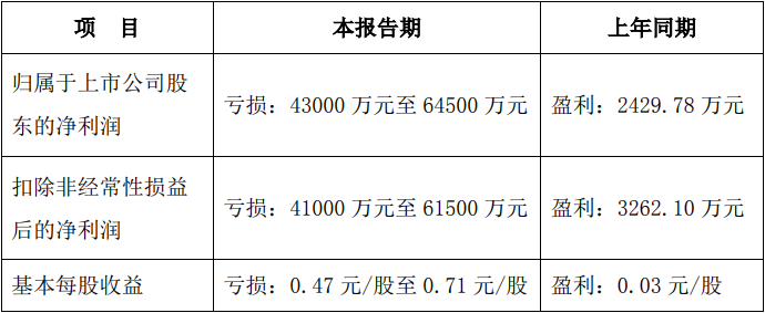 1月18日晚间星期六业绩预告显示,公司预计2021年度归属于上市公司股东的净利润为亏损4.30亿元至亏6.45亿元,上年同期盈利2429.78万元。基本每股收益为亏损0.47元/股至0.71元/股。