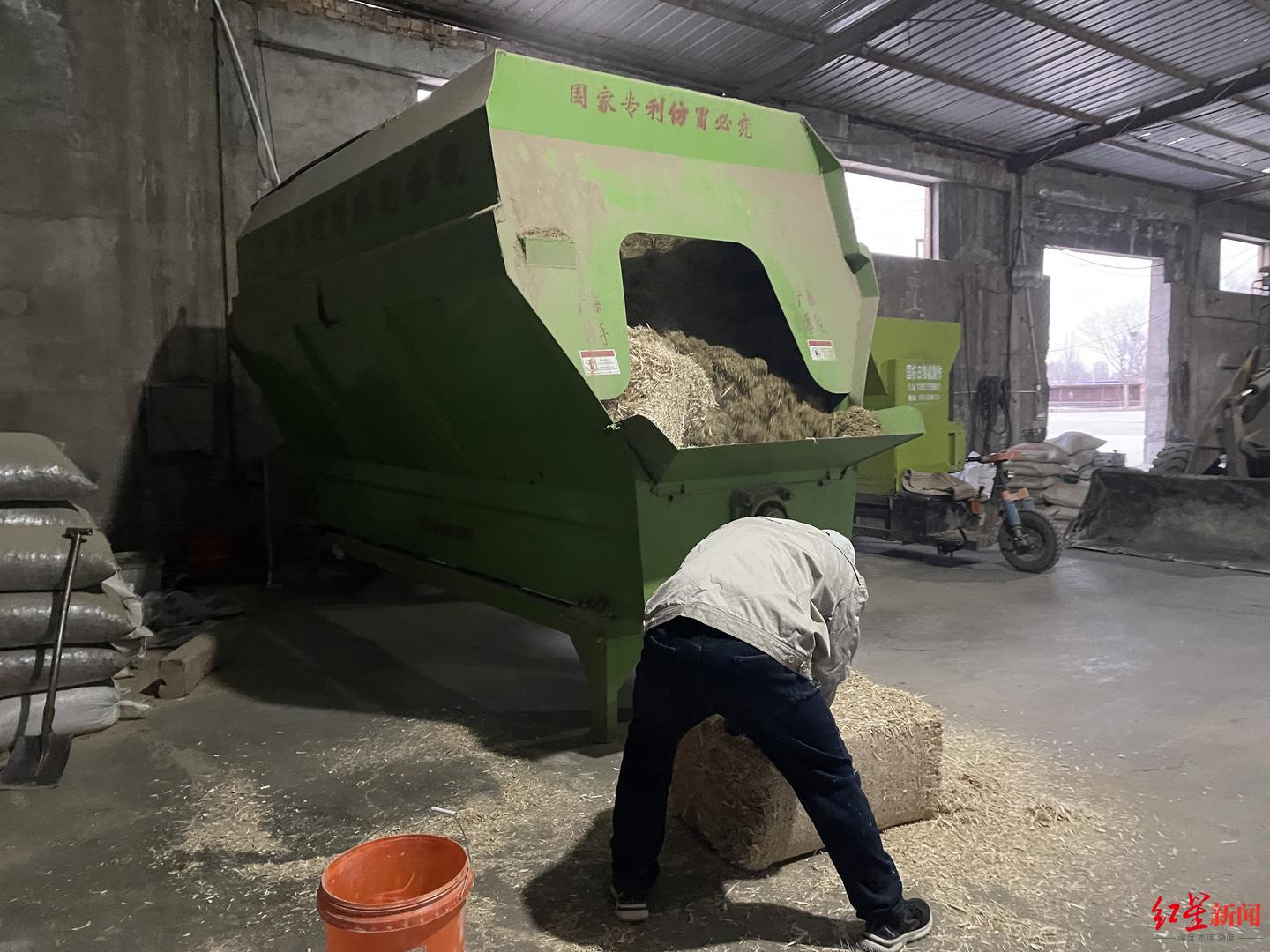 一个小型养殖场里,养殖户在加工饲料。奶价下跌饲料价格暴涨正在挤压奶牛养殖利润。