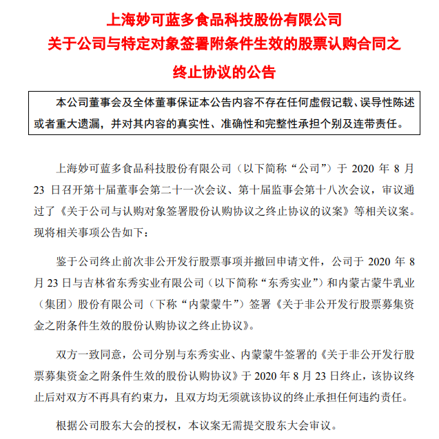 蒙牛认购妙可蓝多股票预案终止
