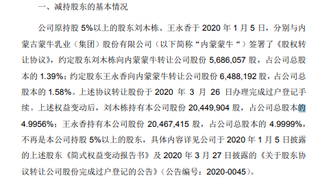 8月21日,即最新非公开发行股票预案披露的前两天,妙可蓝多发布公告称,其股东刘木栋、王永香合计违规减持股票约1236.72万股,占妙可蓝多总股本的3.02%。值得注意的是,这两名股东正是年初转让股权给蒙牛集团的两名自然人股东,而在转让之前均为持股超5%,转让后刚好降至5%以下。这次股权转让于3月26日完成过户登记手续。