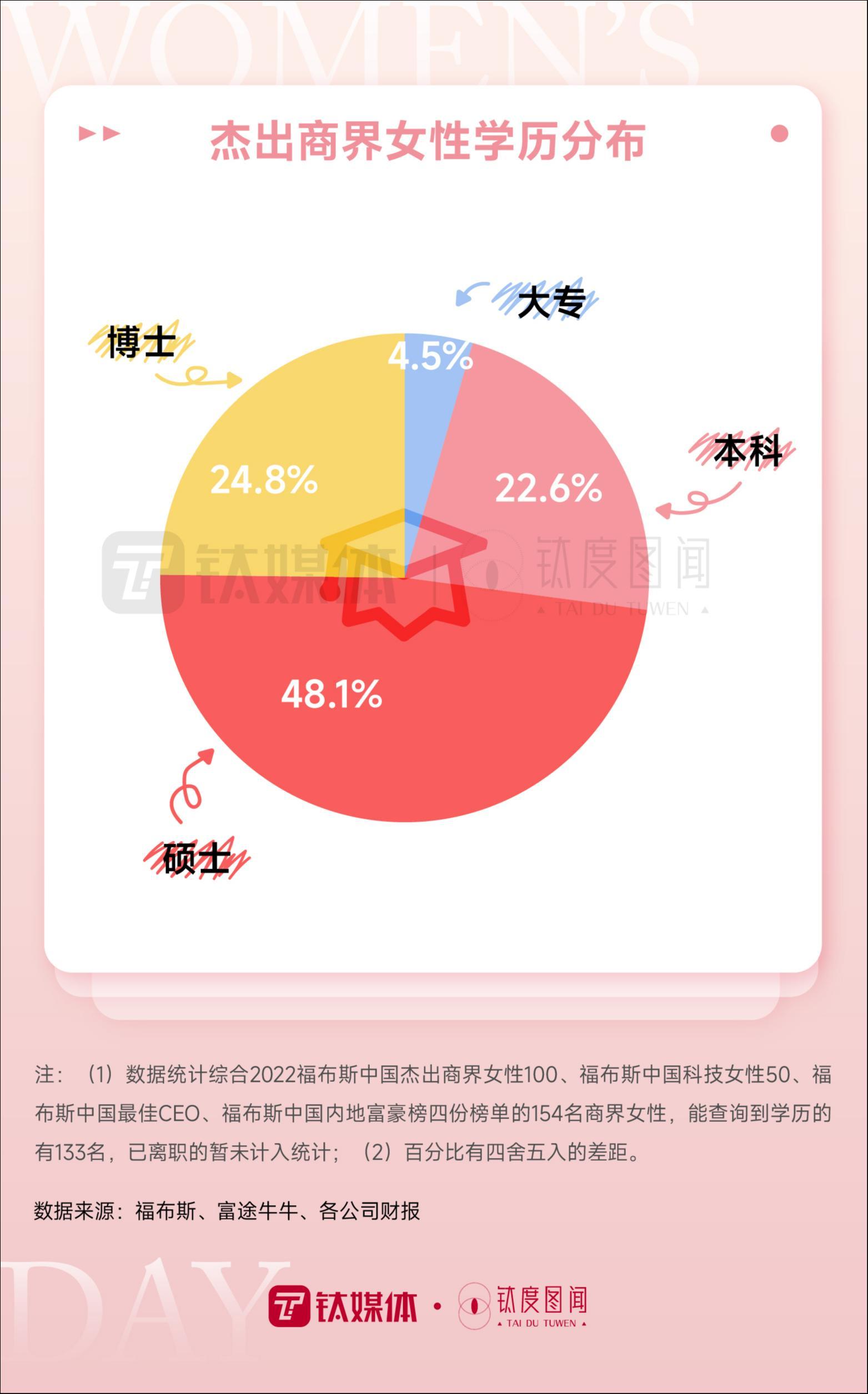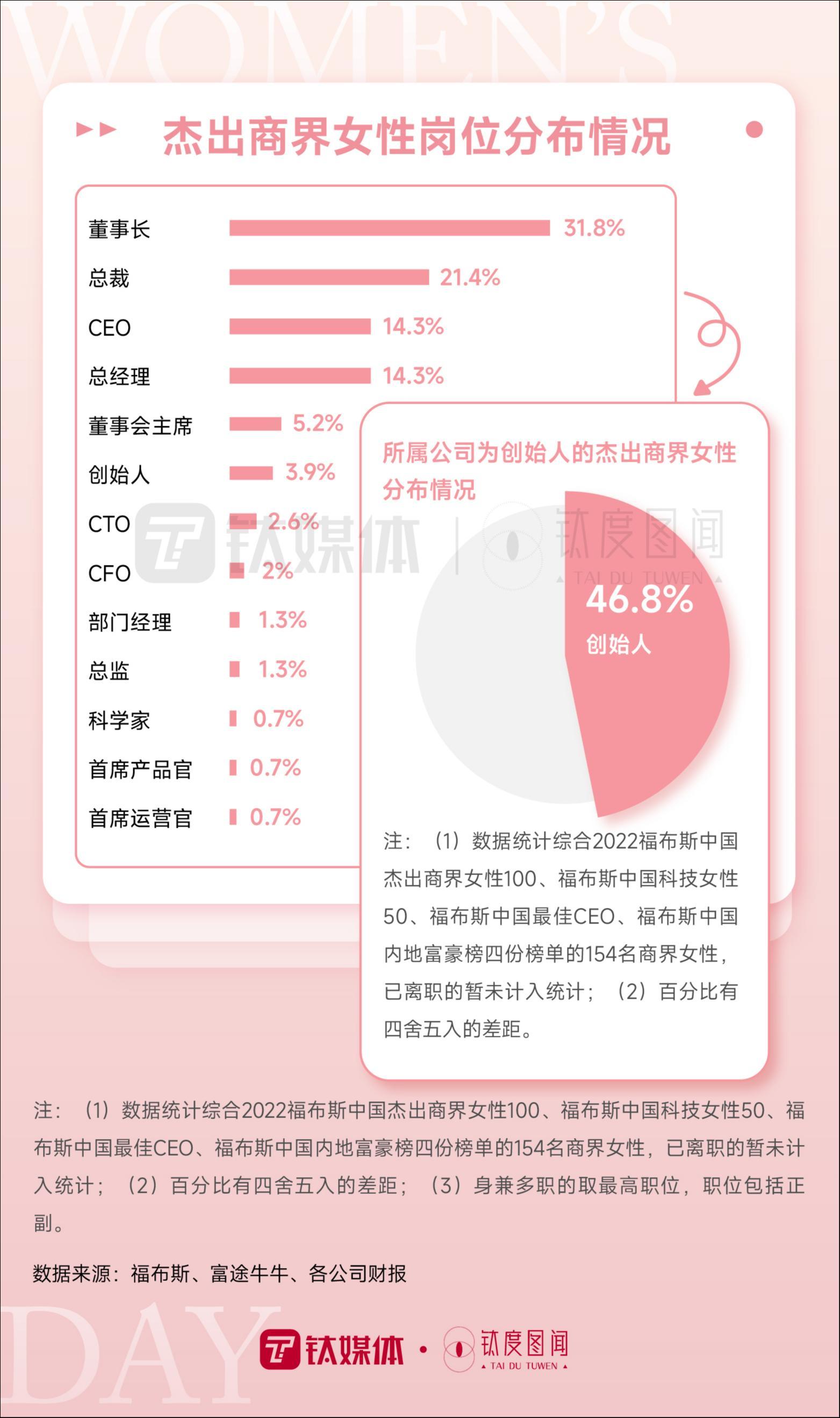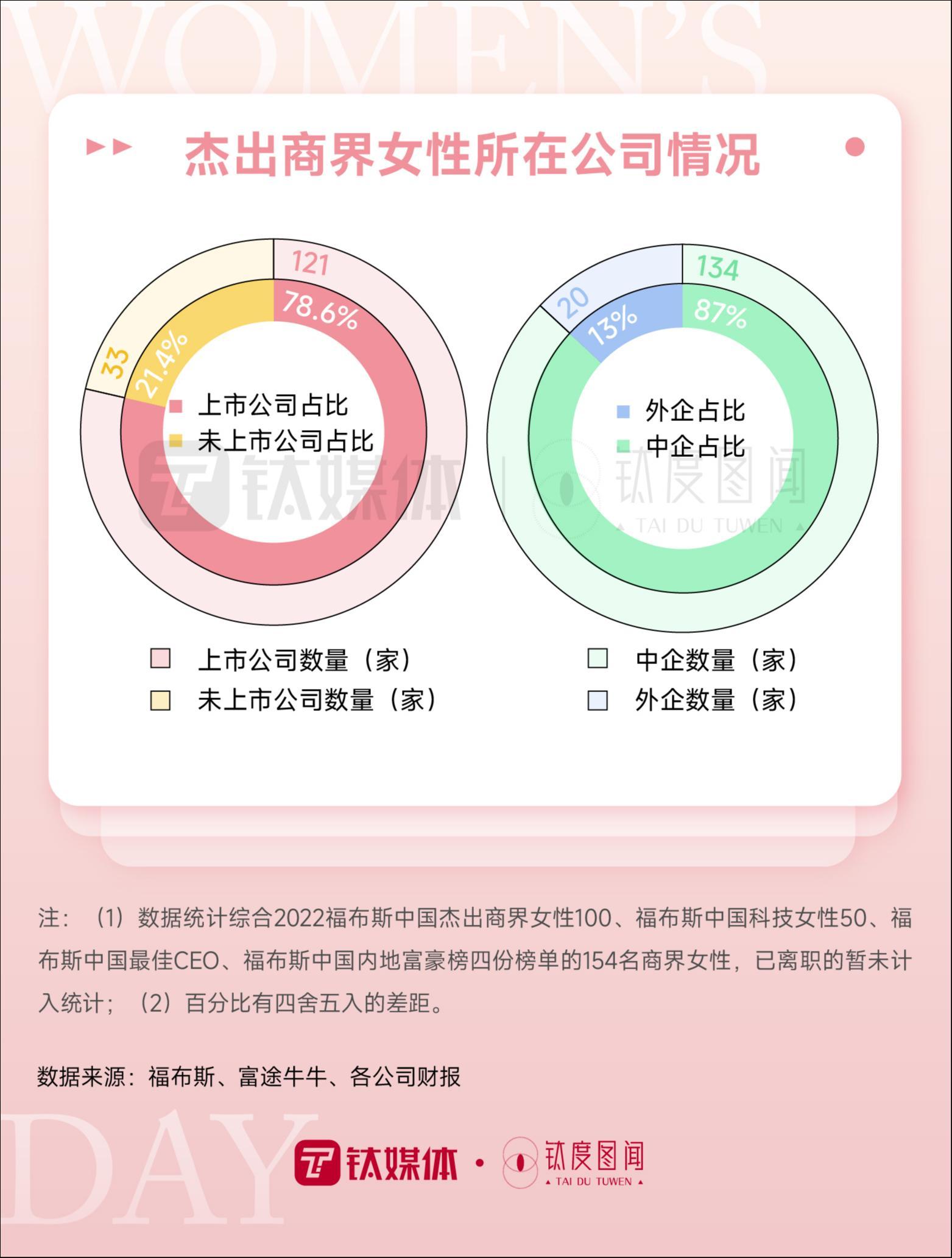 中国商界女性有多厉害?钛媒体·钛度图闻统计了“2022福布斯中国杰出商界女性100”、“2022福布斯中国科技女性50”、“2022福布斯中国最佳CEO”、“2022福布斯中国内地富豪榜”四份榜单中的154名商界女性,“解密”杰出商界女性背后的数字密码。