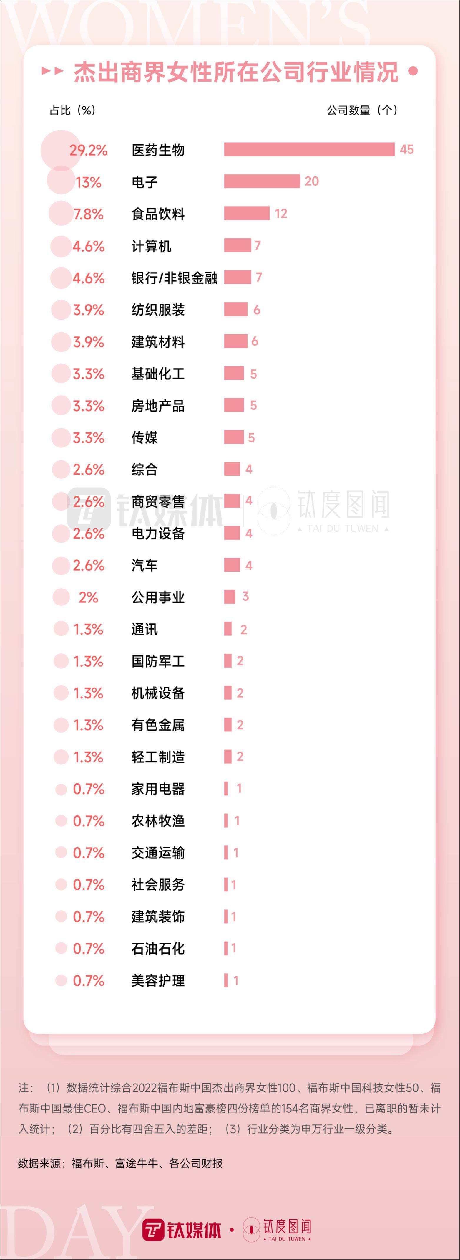 据钛媒体·钛度图闻统计,在154名杰出商界女性所在的公司中,涉及31个申万一级行业分类中的27个行业,她们大多都属于高新技术领域。