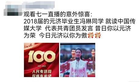 “特别巧!10年前,五年级的我就在学校组织的建党90周年庆祝活动上,参加了向党献词的朗诵表演。没想到,10年后,我竟然能站在天安门广场,在庆祝中国共产党成立100周年大会上朗诵!”中国传媒大学播音与主持艺术专业的大三学生冯琳在接受媒体采访时,连呼自己“太幸运了”。