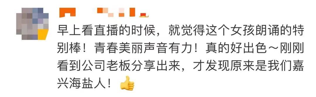 “突然听到一个熟悉的声音,再一看脸也很熟悉,才确认其中一个领诵员就是冯琳学姐。”黄欣媛激动地发了朋友圈,不一会,海盐老家的同学、老师们也纷纷刷屏,“大家都为她感到高兴。”