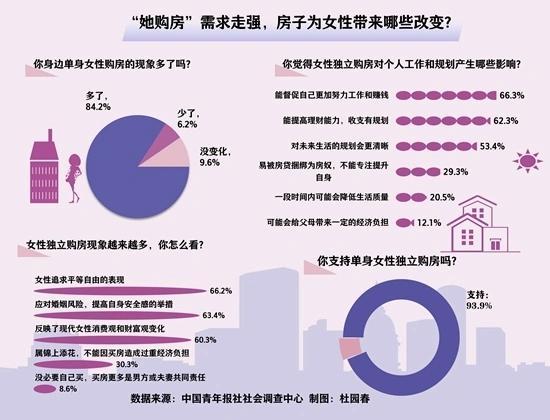 近日,中国青年报社社会调查中心联合问卷网,对2006名受访者进行的一项调查显示,84.2%的受访者感觉近几年身边单身女性购房的现象多了,93.9%的受访者支持单身女性购房。对于女性独立购房的影响,66.3%的受访者认为能督促更加努力工作,62.3%的受访者觉得能提高理财能力,收支有规划。