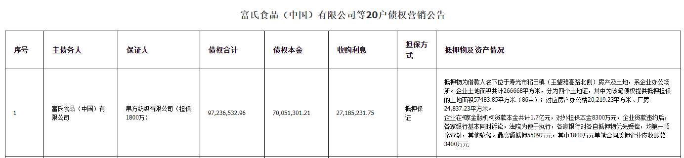 其实,2018年9月,民生银行对富氏食品的一笔共计4542万元(本金3000万元)的金融债权,也以2650万元的价格在阿里平台成功拍卖。其中的2700万元授信额度,正是由富氏工业园内的土地、生产车间以及建筑物作为抵押担保。