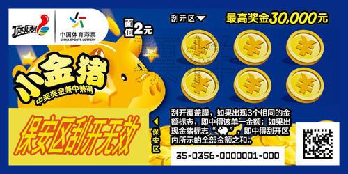 面值2元的“小金猪”中高奖丰厚,最高奖金3万元。票面主题有趣,游戏超值,萌萌的聚财小金猪,憨态可掬,十分可爱,极具亲和力。票面使用蓝、黄撞色设计,时尚亮丽,符合流行趋势。金币符号给人财富汇集之感,迎合购彩者的心理预期,与小金猪存钱罐流行形象相呼应,颇具趣味。该票玩法简单易懂,采用“多同”+“通吃”的游戏玩法,刮开覆盖膜,如果出现3个相同的金额标志,即中得该单一金额;如果出现“金猪”标志,即中得刮开区内所示的全部金额之和。中奖奖金兼中兼得。