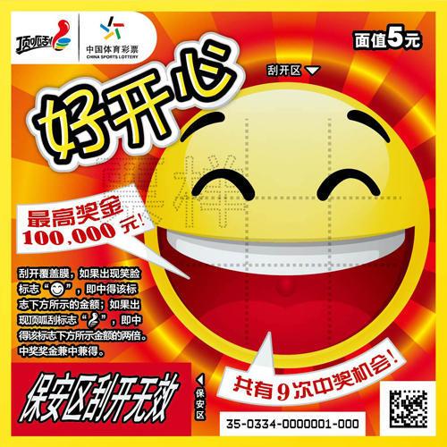 面值5元的“好开心”,一张彩票有9次中奖机会,中小奖超丰厚,最高奖金10万元。这款票以互联网时代最流行的社交软件表情符号为主要创意,精选其中最经典、最为人熟知的三个笑脸符号,贴近大众,紧跟时代,有亲切感。票面效果出众,概念亲切,此款彩票玩法也很简单:刮开覆盖膜,如果出现“笑脸”标志,即中得该标志下方所示的金额;如果出现“顶呱刮”标志,即中得该标志下方所示金额的两倍。中奖奖金兼中兼得。