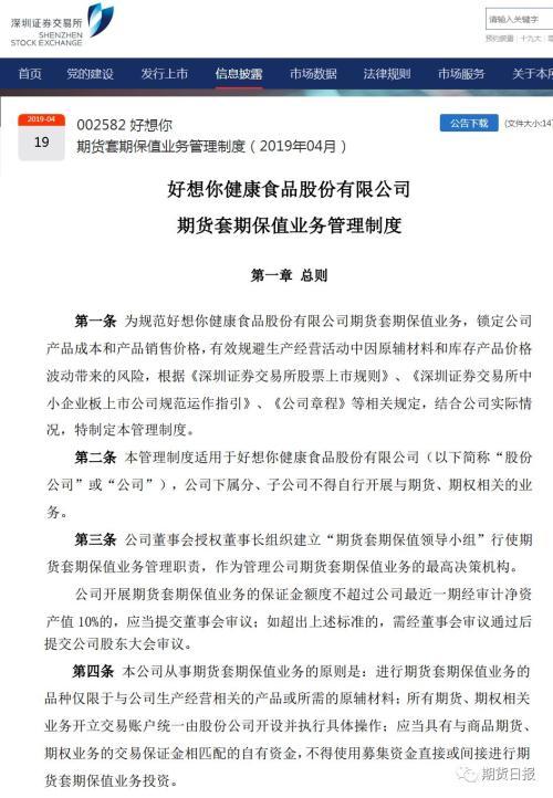 公告称,红枣是公司重要的生产加工原料,红枣市场价格的涨跌对企业的利润有较大的影响。近年来,受红枣行业发展及市场供求变化的影响,红枣价格波动剧烈,公司的生产经营面临一定的市场风险。为有效规避风险,对冲红枣价格波动对公司生产经营的影响,保证公司业务健康、稳定增长,公司拟利用期货套期保值操作,进行风险控制,减少和降低红枣价格波动对公司正常生产经营的影响。