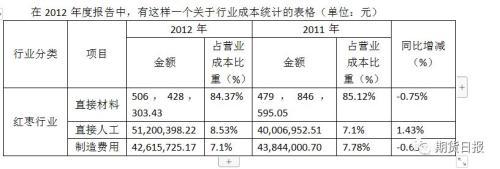 可以看出,在2012年好想你的主营业务成本中,85%左右都是直接材料,直接人工和制造费用占比相当。