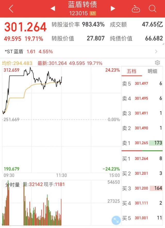 蓝盾转债价格涨破300元,溢价率一度接近1000%
