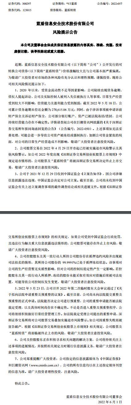·2022年5月23日,公司召开2022年第二次临时股东大会审议通过了《关于拟向法院申请重整及预重整的议案》。截至目前,公司尚未向法院提交重整及预重整的正式申请。法院能否决定公司进行预重整,公司的重整申请能否被法院裁定受理,以及具体时间尚存在不确定性。如法院裁定受理公司提出的重整申请,深圳证券交易所将对公司股票交易叠加实施退市风险警示。如公司因重整失败而被宣告破产,根据《深圳证券交易所创业板股票上市规则》相关规定,公司股票及“蓝盾转债”将面临被终止上市的风险,敬请广大投资者注意投资风险。