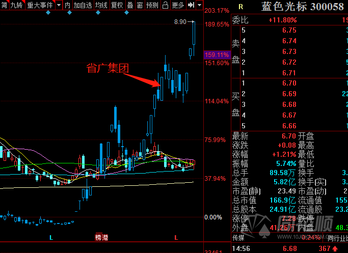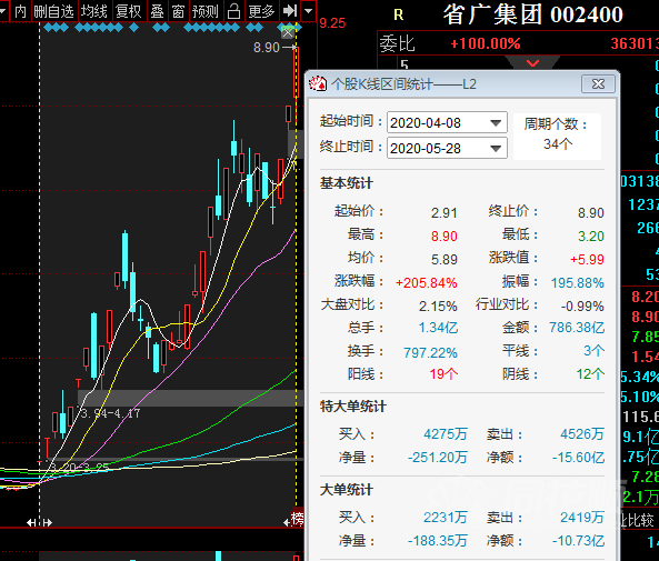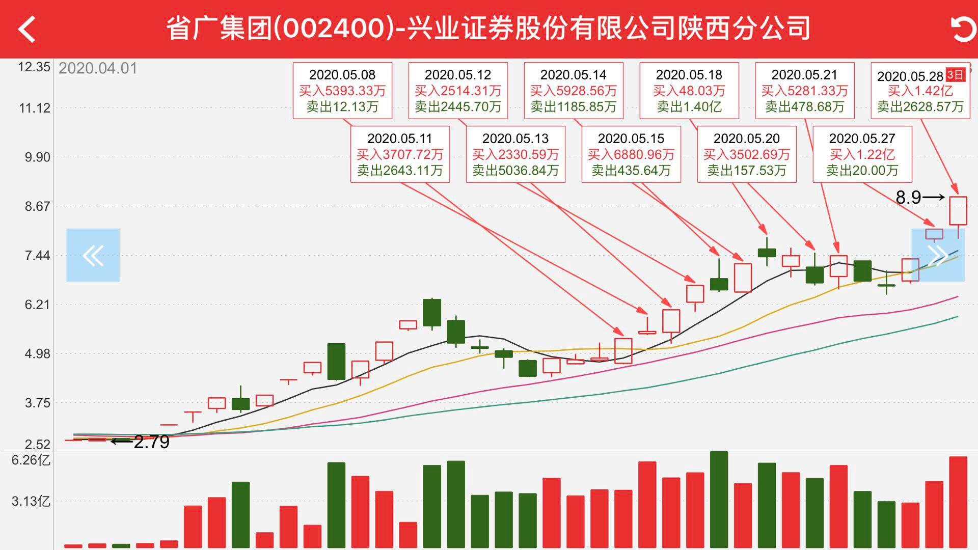 观察龙虎榜发现,省广集团不仅仅有赵老哥、章盟主等知名大佬游资“捧场”,同时还有一游资席位多次大手笔参与。数据显示兴业证券陕西分公司自5月8日以来龙虎榜上榜次数多达11次。可以看出,短线资金的追捧是造就省广集团走妖的一个很大因素。