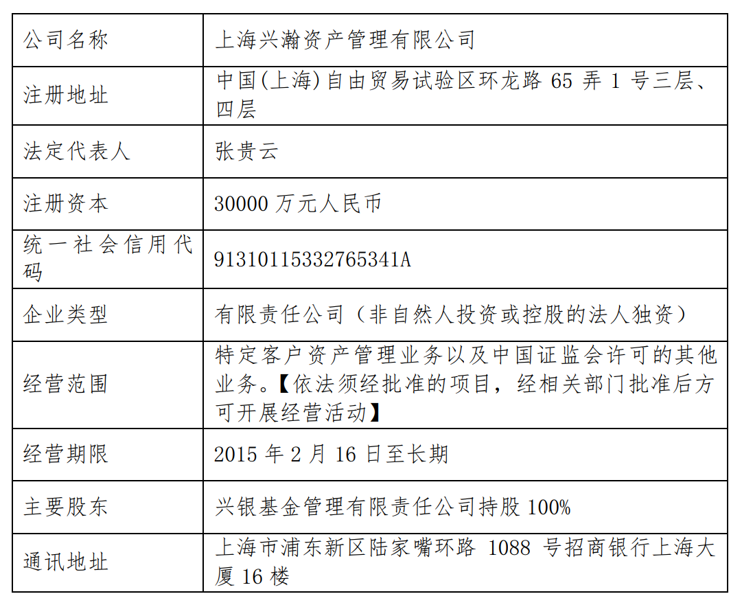 资料显示,兴瀚资管注册地上海,注册资本3亿元,法定代表人张贵云,兴银基金持股100%,主要开展特定客户资产管理业务及中国证监会许可的其他业务,既服务于实体经济,又满足客户对财富管理的多元化需求。