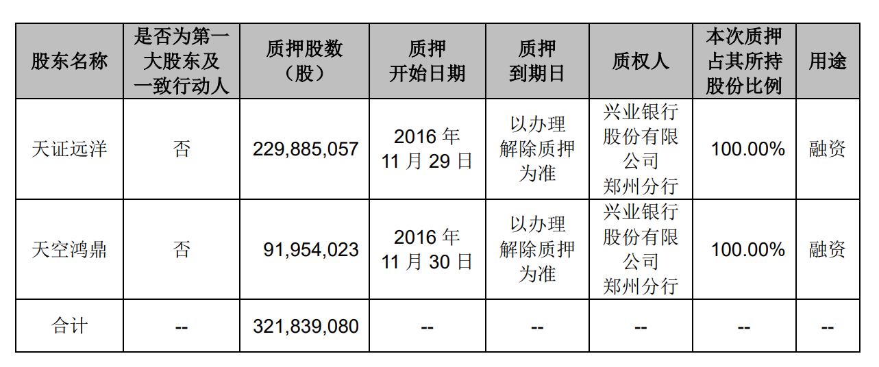 2016年11月完成的定增,转眼当年11月29日和30日,天证远洋和天空鸿鼎就相继将所持股份一股不剩地质押了出去,质权人均为兴业银行郑州分行。