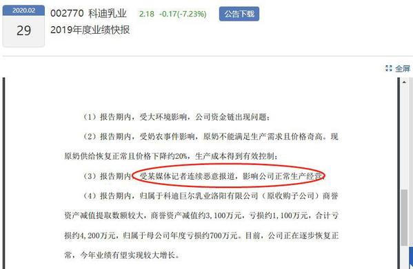 2月28日晚间科迪乳业发布的2019年业绩快报显示,期内公司预计实现营业收入8.13亿元,同比下滑36.77%,净利润亏损4962万元,同比大幅下滑138.43%。在公告表述经营业绩情况时,科迪乳业表示“报告期内,受某媒体记者连续恶意报道,影响公司正常生产经营。”
